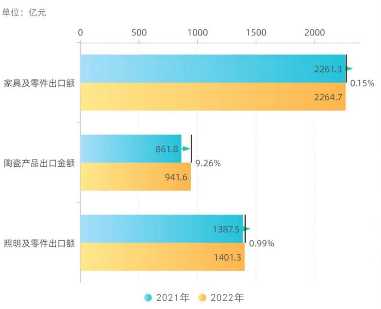 據(jù)海關(guān)統(tǒng)計(jì),家居建材方面,今年上半年,家具及其零件出口金額為2264.7億元,同比去年(2261.3億元)增長(zhǎng)0.2%;陶瓷產(chǎn)品出口金額為941.6億元,同比去年(861.8億元)增長(zhǎng)9.3%;燈具、照明裝置及其零件出口金額為1401.3億元,同比去年(1387.5億元)增長(zhǎng)1%。