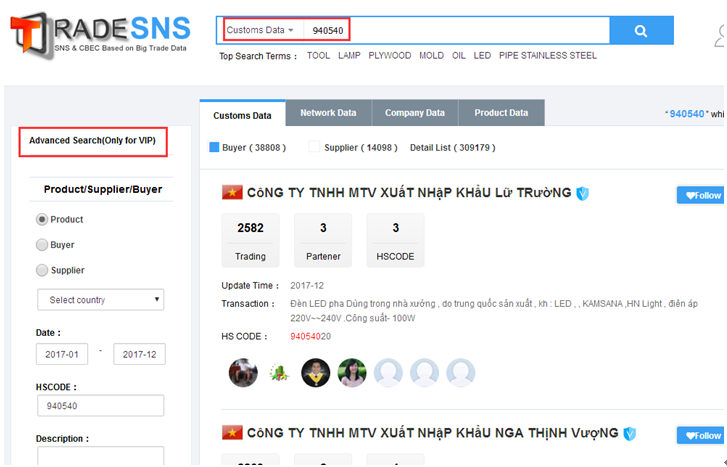 I. Customs Data search entrance is the top ofthe search box, select import andexport data, enter product information, thefollowing to search for HS 940540 examples. (Note: search terms can be English names, or the top six HScodes).