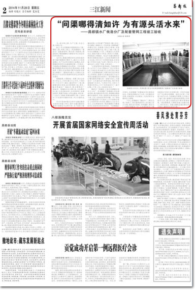 根據地委、行署的統一部署,項目總投資1.93億元,日供水量3萬立方米,于2013年7月4日正式開工建設,建設凈水廠1座,配套建設取水壩及120米管架橋1座,取水、輸水管道總廠39023米,配水管網總廠22140米。修建綜合辦公樓1座,水處理車間1座,以及變配電間、反沖洗泵房、加氯加藥間、絮凝平流池、V型過濾池、清水池、門衛(wèi)室大門圍墻、附屬設施等工程,于2014年7月20日完成所有建設內容,并正式通水運行。