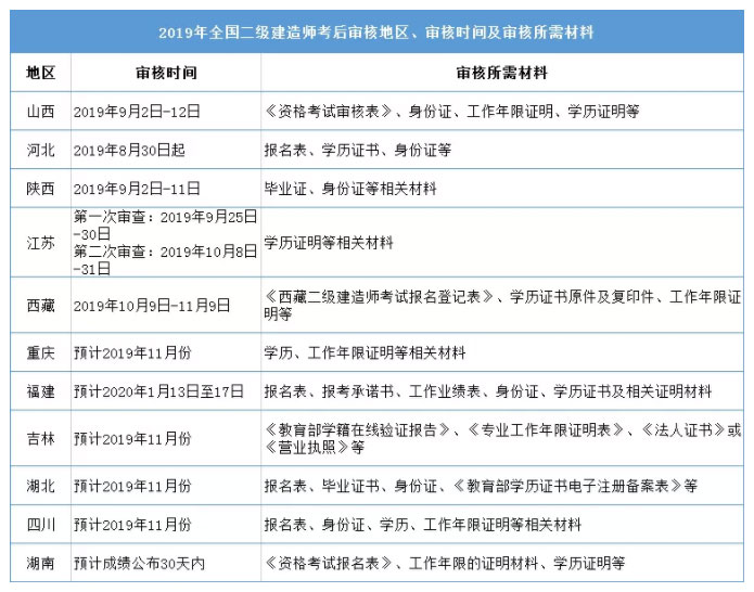 二建考試到現(xiàn)在已過(guò)了五月,大部分省市都已公布成績(jī)及合格標(biāo)準(zhǔn)。2019年有不少省市二建是有要求考后審核的。除了江西,其他地方怎么規(guī)定呢?以下是整理的二級(jí)建造師考后審核的地區(qū)及資料,供大家參考,希望對(duì)考生們有所幫助。ㄔ敿(xì)信息以官方文件為主)