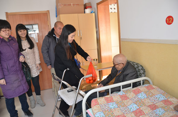 11月29日上午,在集團工會副主席張娟娟的帶領下,中太建設集團的12名團員青年代表,驅車來到中太康復醫(yī)院慰問老人、送去愛心,并給老人帶去新鮮的水果。到達醫(yī)院后,他們在康復醫(yī)院醫(yī)護人員的陪同下,進入病房與老人談心聊天,了解老人的吃住情況,并像醫(yī)護人員了解老人的住院治療情況,宛如一家人一般,一時間房間里充滿了濃濃親情。
