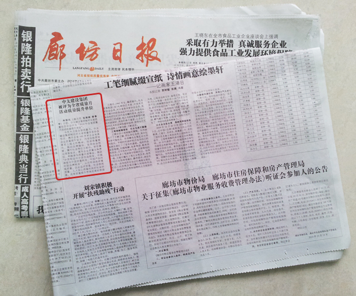 廊坊日報報道了中太建設集團被評為全省質(zhì)量月活動質(zhì)量提升單位